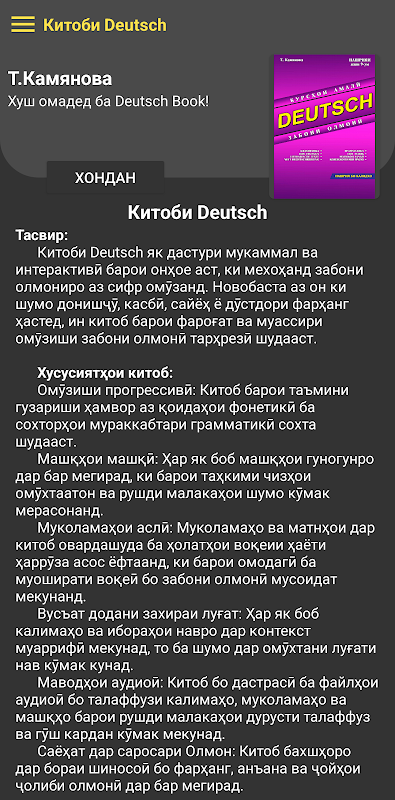 Китоби "Deutsch" как датьтури мукаммал в интерактиве барои онҳое аст, ки мехоҳанд забони олмониро аз сифр омезанд. Новобаста аз он ки шумо донишҷӯ, касбӣ, сайёҳ ё дӯстдори фарҳанг ҳастед, в китоб барои фароғат ва муассири омӯзиши забони олмоне тарҳрезӣ шудааст.