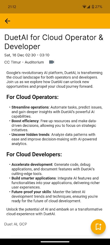Официальное приложение конференции DevFest Cloud Bandung для навигации по конференции. С помощью приложения вы можете: