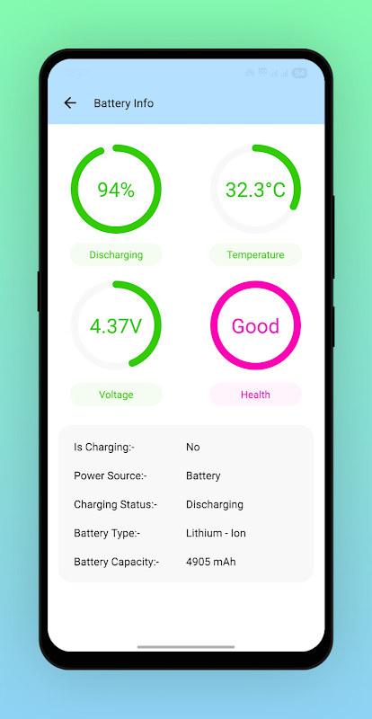 Получите информацию о температуре, аккумуляторе, напряжении и состоянии аккумулятора вашего устройства.