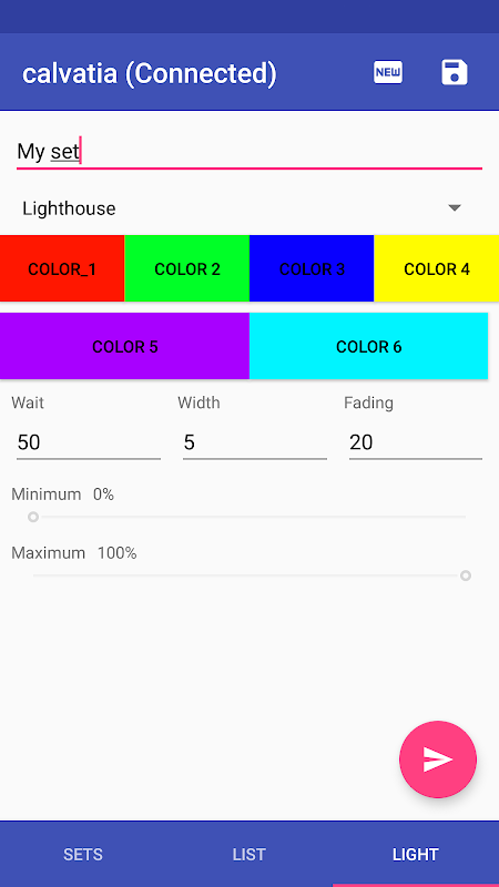 In the “light” tab we can change the colors and other parameters of the light configuration and also the set on the top. By pressing the floating action button on the bottom right the configuration will be sent to the light. If we want to save our configuration for later we need to press the “save” button in the action menu.