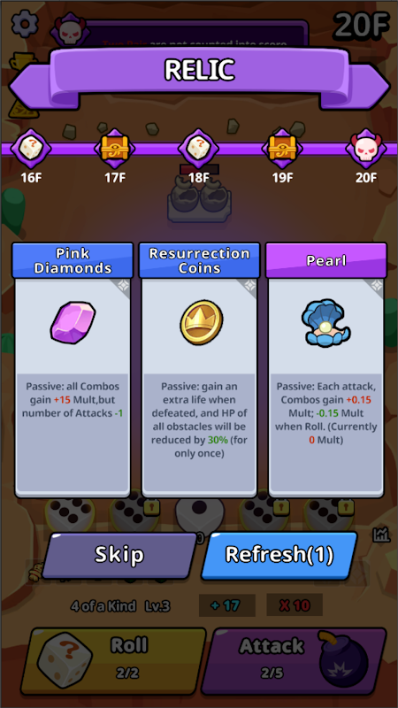 Более 100 реликвий с разными эффектами и 9 типов комбинаций кубиков можно использовать для сопоставления в игре! Возьмите свои кубики и начните испытание!
