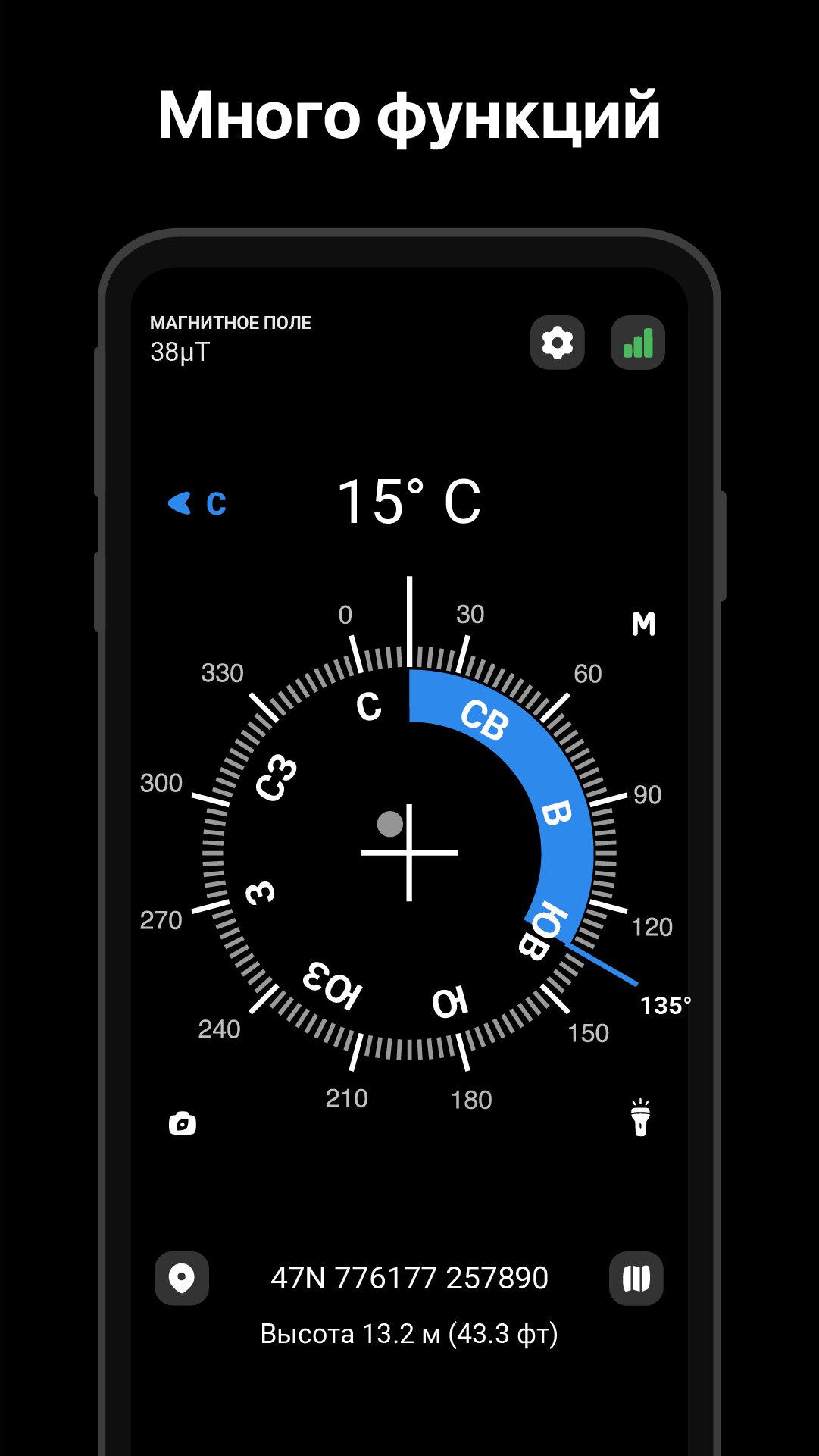 С помощью GPS-компаса вы можете узнать свое местоположение, измерить высоту (альтиметр) и проверить силу магнитного поля вокруг. Встроенный фонарик делает использование удобным ночью и в темных местах.