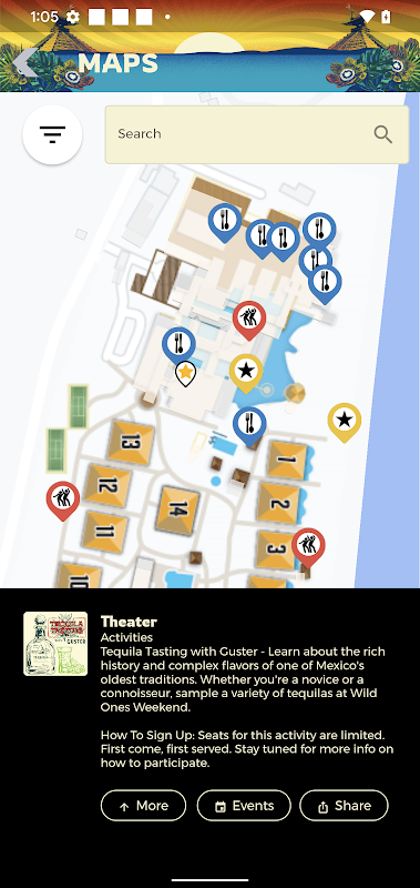 Концертные площадки – главная сцена на пляже, беседка у бассейна и ночная сцена-палапа – славятся своей интимностью и удобством, а также гостевыми люксами и услугами «все включено». Выступления на этих уникальных тропических сценах гарантированно оставят незабываемые впечатления.