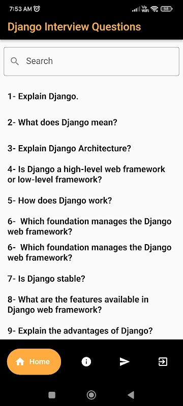Вопросы для интервью с Django. Для тех, кто особенно интересуется Django, в нашем приложении есть специальный раздел с более чем 100 вопросами, посвященными концепциям Django. Углубите свои знания и укрепите свою уверенность в сценариях интервью Django.