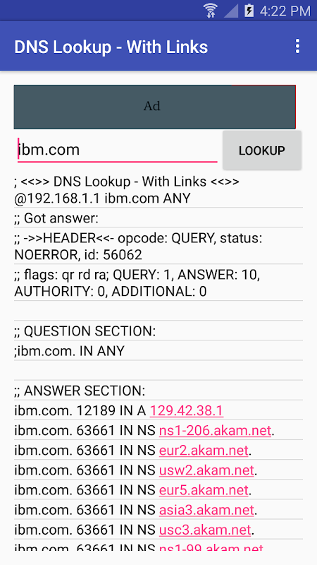 Lookup домены в системе доменных имен. Домены в результатах являются интерактивными.