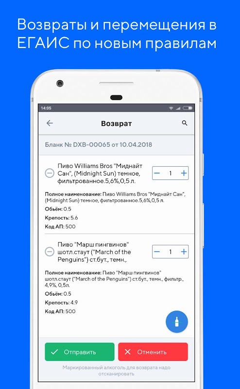 DocsInBox позволяет быстро и удобно осуществить приемку, формировать акты списания, бланки возвратов и перемещений для ЕГАИС. Бармену или кладовщику достаточно просто отсканировать акцизу!