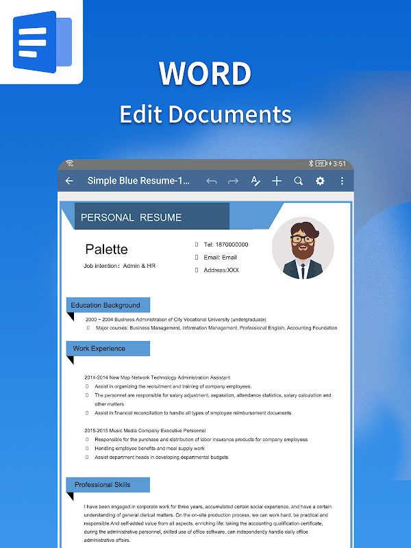 Редактор документов предоставляет вам различные шаблоны документов, шаблоны листов и шаблоны слайдов, в том числе: шаблоны личных резюме, шаблоны сводок о работе, шаблоны трудовых договоров, шаблоны договоров аренды, шаблоны контрактов на неполный рабочий день, шаблоны отчетов о работе и т. д. Вы можете легко используйте шаблоны для редактирования документов в документах, таблицах и слайдах, делая ваш мобильный офис более эффективным.