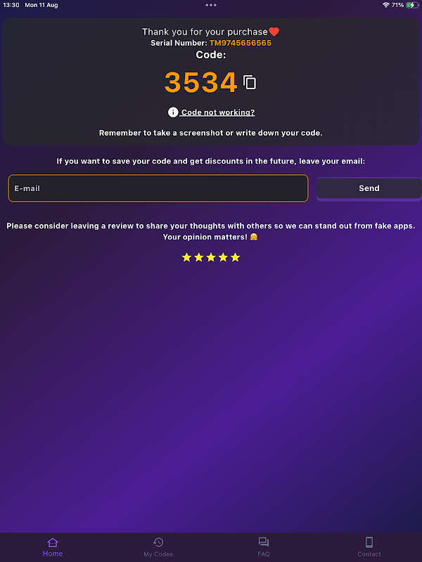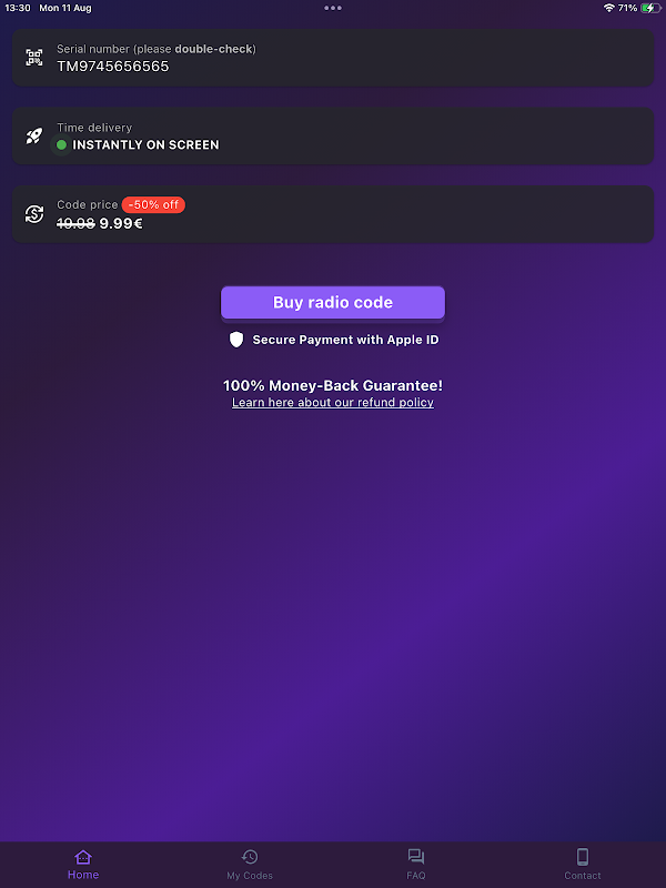 Просто введите серийный номер (S/N) вашей магнитолы в наше приложение, чтобы проверить, появится ли ваш код мгновенно⚡ на экране после оплаты. 📲💸