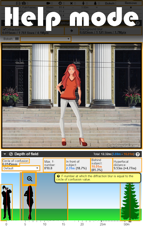 Глубина резкости Фото калькулятора с визуальным размытием фона и боком моделированием