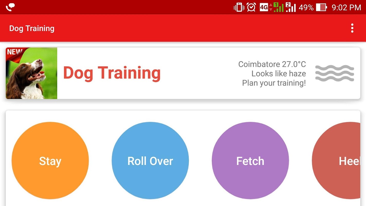 Finally you have a dog! Looking for how to train him? Use this simplest dog training app. Teach your dog how to listen, sit, lie down, stay at a place, roll over, fetch or heel with this application. Get real time weather from within the application to plan your outdoor training.