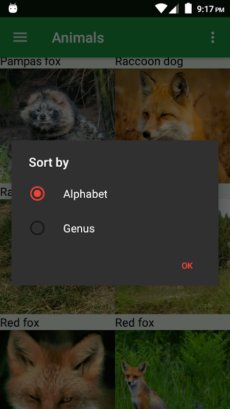 - Сортировка по названию (алфавит) или жанру (Canis, Lycaon, Atelocynus, Cerdocyon, Lycalopex и другие).