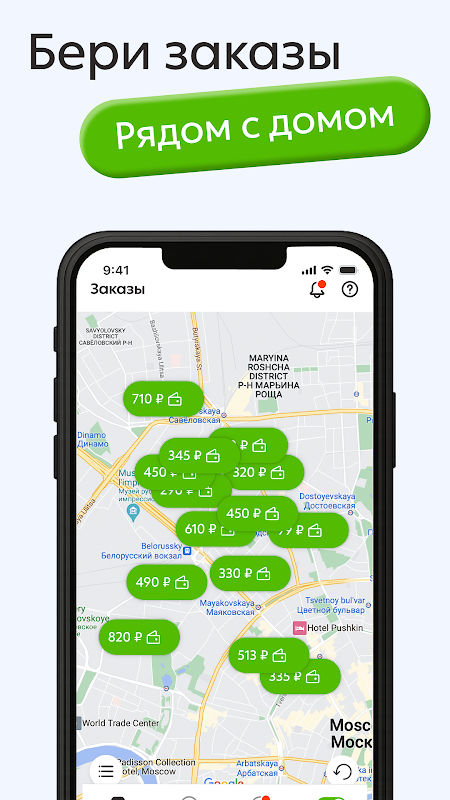 Работайте курьером каждый день или подрабатывайте в удобное время; просто выберите в приложении заказ поблизости. Доставка в слотах (от 4 до 12 часов) помогает зарабатывать больше.