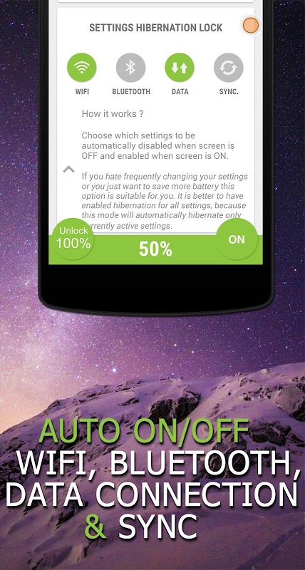 Hibernating Settings like WIFI, Data Connection, Bluetooth and Sync makes this app even more useful & handy. Its just like when you turn OFF your device's screen the WIFI automatically shuts OFF and when you turn on the screen the WiFi automatically turns ON and start connecting to the available WIFI network. The same case happens with the Data Connection as well. So you don't need to manually ON/OFF these settings, because this can be done automatically using this app.