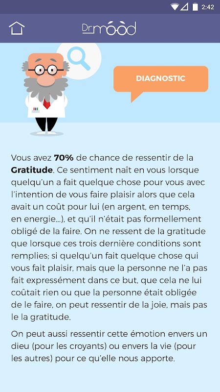 После этого этапа тестирования, д-р Настроение обеспечивает диагноз, основанный на панели двадцати эмоций (например, страх, тревога, гнев, стыд, ревность, печаль, социальное отторжение ...) наиболее часто чувствовал и выражается в жизни каждый день, дома и на работе. Цель состоит в том, что пользователь начинает (наконец) "имя" на эмоциональное состояние, он чувствует и понимает, "почему" эта эмоция рождается в нем.