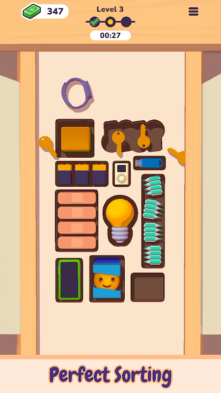 Каждое задание на тренировку мозга будет бросать вам вызов с различными объектами, которые нужно расположить в правильных разделах. Вы будете стремиться к идеальной точности, если хотите обеспечить плотную посадку для окончательного триумфа опрятности.
