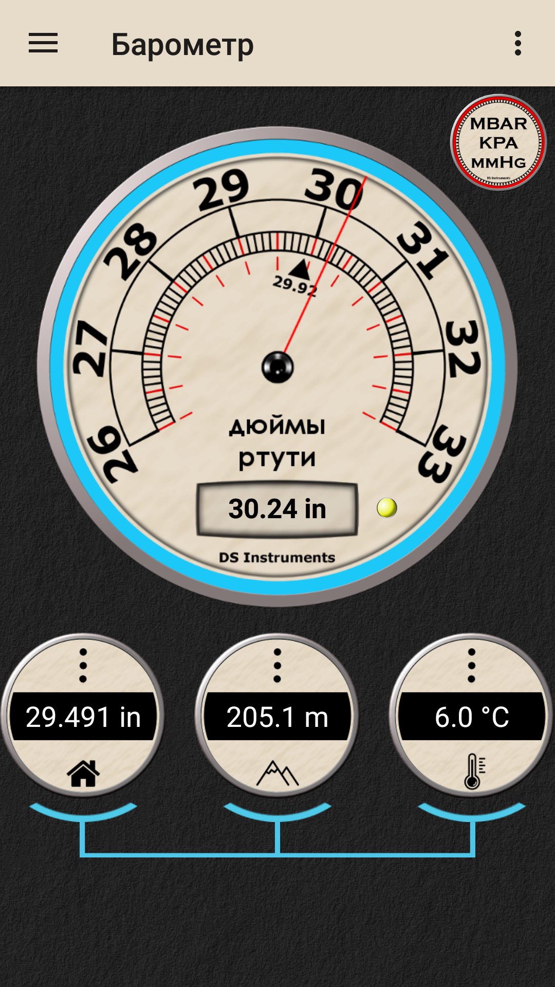 Устройства без барометрического датчика давления покажут барометрическое давление в вашем местоположении, используя GPS и интернет-соединение.