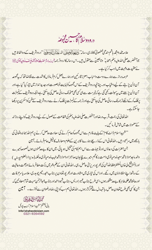 Я очень благодарен всем тем, кто играют важную роль в завершении этой задачи, в частности, мой отец Маулана Muhammd Саида Ludhyanvi, дядя Сахибзада Гуссейн Muhammd Таййиб Ludhyanvi (ректор Дарул Улум Yousfiyah), и д-р Шейх Вали Хан аль-Музаффар, чья всестороннего надзора всегда оставались доступными. Пусть Аллах благословит их жизнь и знания, и поглотит их Своей безопасности. Я также очень благодарен Амжада Рахим Чаудхари, Allaama Ясира Арафата и Хафиз Мухаммад Тахир Talha за ценные предложения при подготовке этой книги "Durood O Салам" и его Android App. Кроме того, мои особую благодарность Umair Идрис, Shahood Ахмад, Абдур Рахман, Syed Bilal и всех тех, кто оказал свою помощь в той или другой стороны. Пусть все благословит всех нас с Его удовольствием. Амин