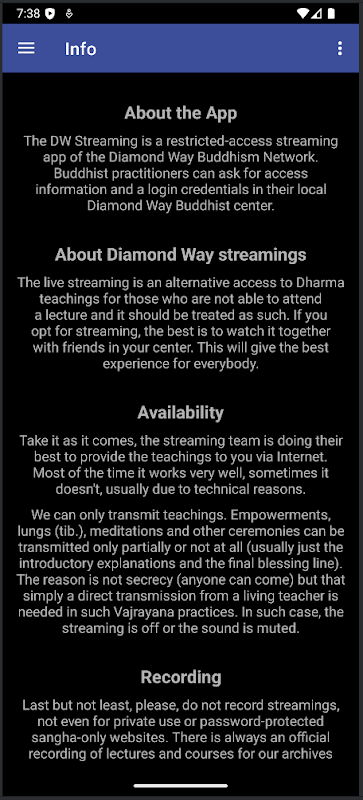 DWBN Streaming является потоковое приложение с ограниченным доступом в Буддизм Алмазного Пути Сети. Буддийские практикующие могут запросить информацию доступа и учетные данные для входа в их местном центре Алмазного Пути буддийского.