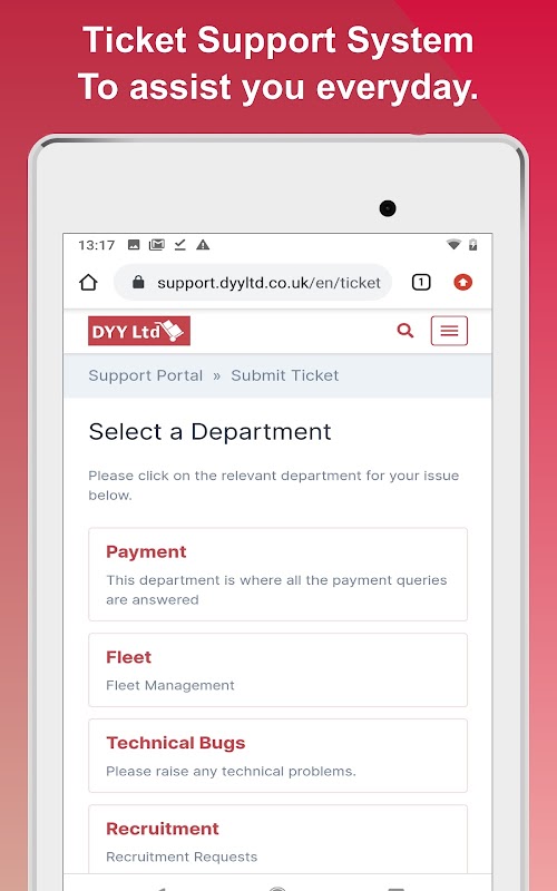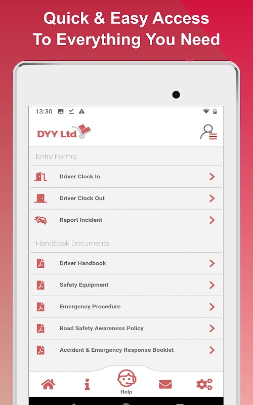 Официальное приложение Dyy Ltd позволяет водителям получать доступ к своим счетам, изменять свою личную информацию, просматривать справочники, отправлять необходимые ежедневные формы и получать обновления и уведомления от назначенных менеджеров.