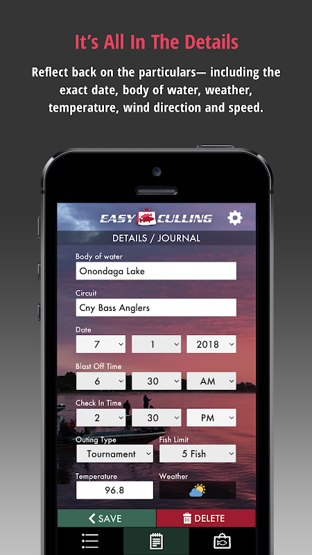 Not only does the Easy Culling App make tournament day go smoothly— *It also makes you a better angler!! The EC App allows you to keep a running journal with detailed notes on your tournament fishing history. Record the exact date, temperature, weather, as well as the depths, baits, locations that were working and those that were not! Look back through years of your hard earned patterns and pick up right where you left off.