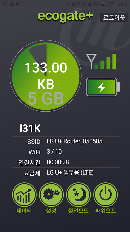 사용자가 모바일라우터에 접근해서 네트워크 정보와 각 종 설정 값을 변경 할 수 있도록 ecogate 앱은 UI화면을 제공합니다.
