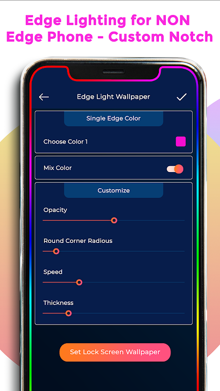 Edge Lighting for NON Edge Phone - Custom Notch app allows users to change simple mobile screen with awesome Live Light Edge color. app has option to set Edge effects like Animation Speed, Thickness, Curve Top, Curve bottom, Edge color and also best option to set Notch to make more adorable edge effects. An application which allows animated live wallpaper theme with that you can set Edge lighting live wallpaper in your device. this application has an amazing User Interface to use and it makes your mobile screen totally adorable with attractive lighting. it allows the user to change the lock screen with choice color.