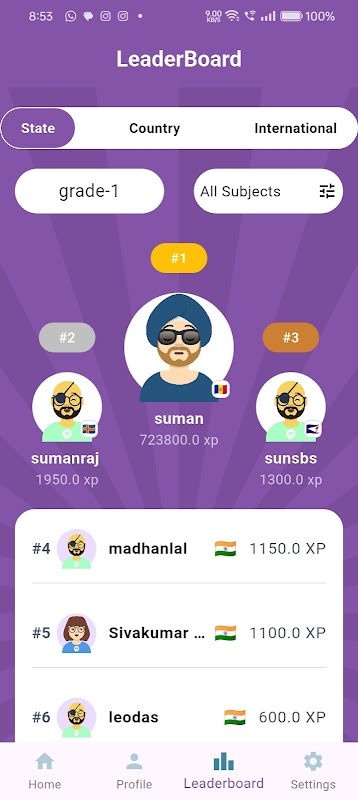 Дети могут практиковать вопросы своих академиков. Когда они продолжают давать правильные ответы, приложение виртуально добавляет пользователям баллы и показывает статус таблицы лидеров.