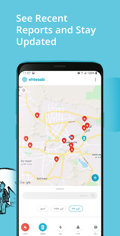 Убедитесь, что проблемы в Кабуле не игнорируются! Участвуйте и общайтесь с согражданами по проблемам города с помощью Ehtesab - инструмента отчетности, который поможет вам узнать о проблемах, таких как безопасность, дорожное движение, электричество, городские услуги и другие категории, которые, по вашему мнению, необходимо учитывать.