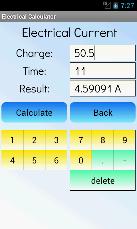 Это бесплатное приложение электричества калькулятор, который может вычислить наиболее важных электрических размеров. Вы можете рассчитать электрическую мощность, электрическое сопротивление, электрический заряд, электромонтажные работы и электрический ток.