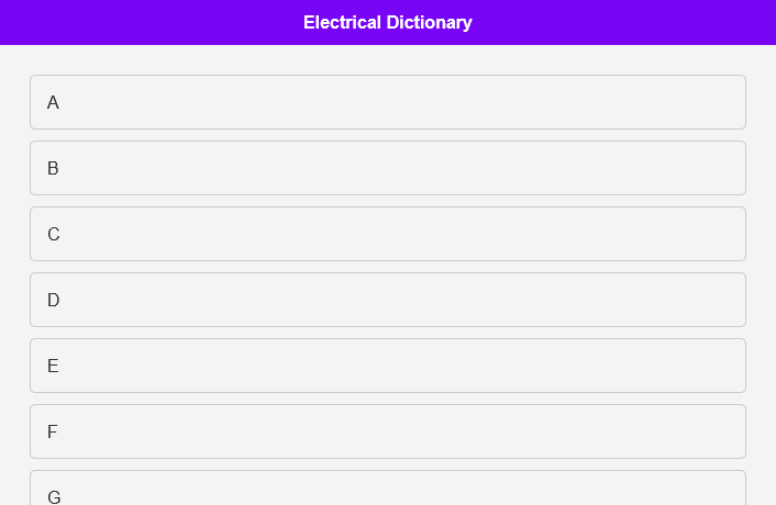 Добро пожаловать в приложение «Электрический словарь», призванное стать вашим всеобъемлющим ресурсом для понимания электрической терминологии. Независимо от того, являетесь ли вы студентом, инженером или энтузиастом. Электрический словарь создан с учетом ваших потребностей с ясностью и легкостью. Если вы ищете приложение для электрического словаря, значит, вы попали по адресу. Это приложение предоставит вам наиболее важные и часто используемые электрические термины со смыслом и примерами.