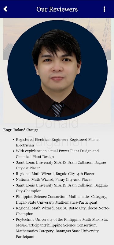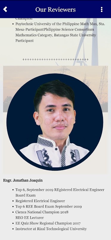 This app is a Learning Management System intended to help users tackle all the Philippine Electrical Engineering Licensure Examination subjects. The app's primary objective is to enhance the knowledge and technical proficiency of the user needed to pass the licensure examination. It is designed to equip the user with the required competencies for a lifelong career in Engineering. Moreover, it also caters to students enrolled in electrical engineering courses.