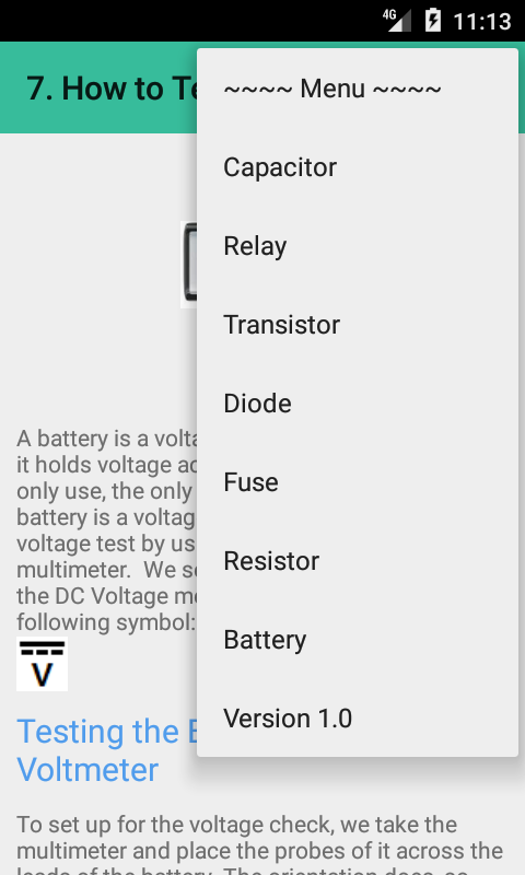 - В этом приложении вы узнаете, как проверить диод, предохранитель, конденсатор, резистор, транзистор, реле, а также бонус: аккумулятор.