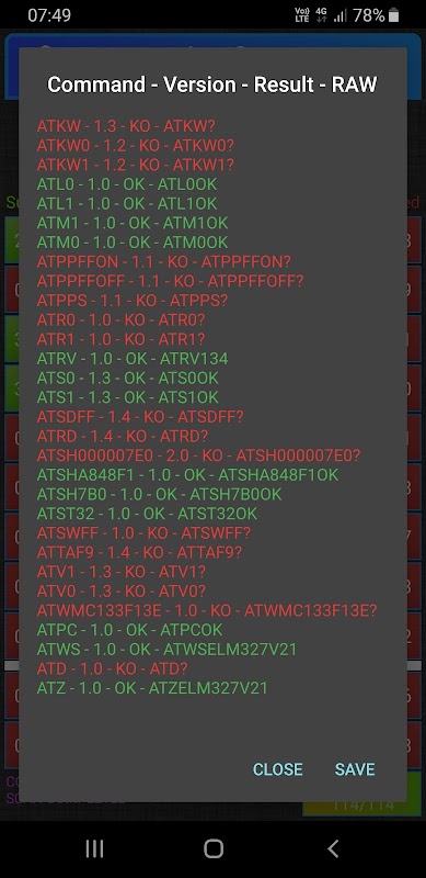 Некоторые AT команды требуют подключение к автомобилю по определенным протоколам. Поэтому, для корректных результатов эти команды не проверятся данным приложением. Общее количество AT команд - 114.