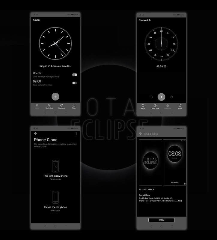 Total Eclipse Theme для EMUI 9.1 отличается и не может быть обновлен из более старой системы EMUI. Есть много графических компромиссов, потому что значки строки состояния и значки панели навигации не видны на черном фоне на устройствах с ЖК-дисплеями (без темного режима).