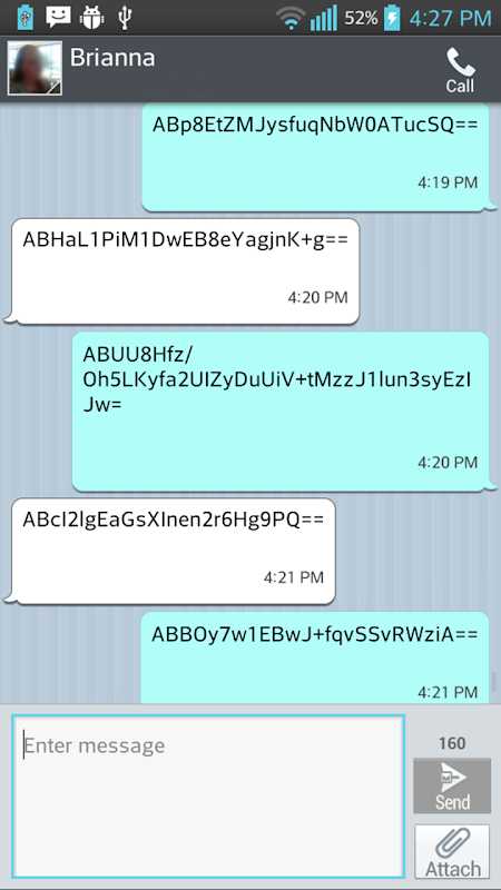 Держите вашу конфиденциальность путем шифрования текстовых сообщений. Все ваши текстовые сообщения будут зашифрованы с помощью шифрования AES. Любые сообщения, которые перехватываются не смогут быть прочитаны. Даже другие приложения на телефоне не смогут расшифровать сообщения. Отличный способ сохранить ваши текстовые сообщения в тайне от посторонних глаз.