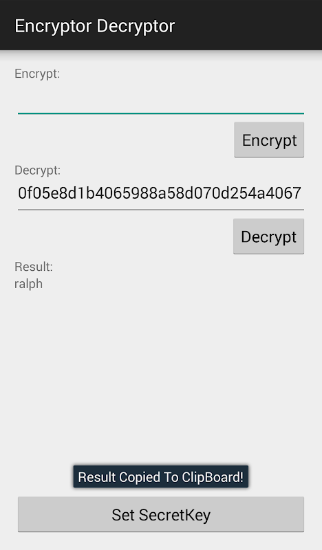 ПРИМЕЧАНИЯ: SecretKey будут сохранены в вашем приложении После введения (может быть изменен в любое время). Ваше SecretKey шифруется, а затем сохраняются, чтобы убедиться, что даже если взломан, никто не сможет украсть вашу SecretKey и расшифровать переданные сообщения.