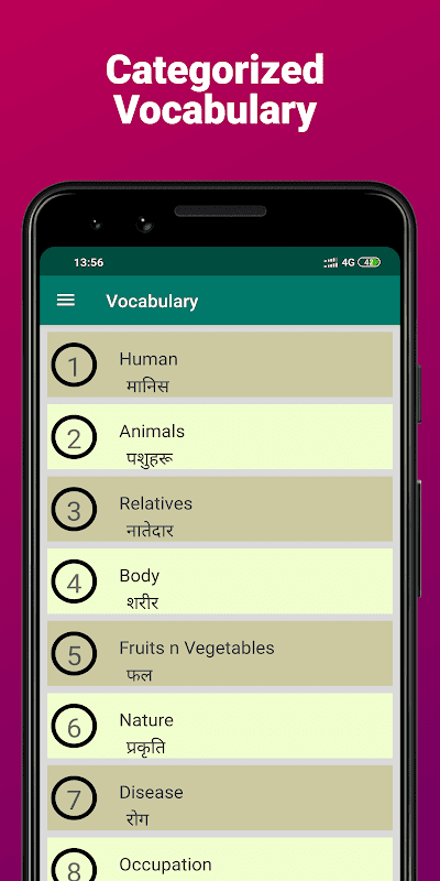 С помощью простого переключателя пользователь может использовать его как словарь непальского английского, где пользователь может искать непальские слова и находить их английские аналоги.