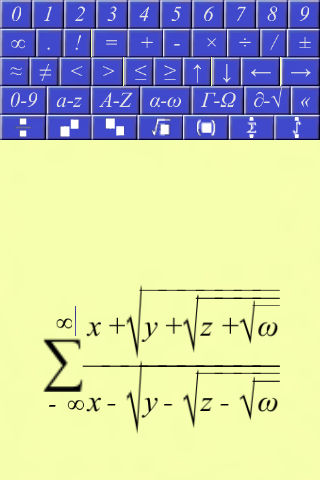 Создание уравнений и искусство письма на ходу. Используйте свой мобильный телефон для создания уравнений. Простой и интуитивно понятный 2D-системы навигации. Полезно для заметок на лекциях или сохранить уравнений, которые вы можете вспомнить в более позднее время. Вы можете создать любой вид уравнений, таких как полиномы, тензорные матрицы уравнений или все, что вы можете думать, поскольку у вас есть полная свобода в том, как организовать символов. Вы также можете создать ASCII искусства, используя различные символы.