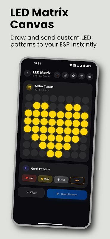 Да! LED Matrix Control позволяет рисовать и отправлять пользовательские шаблоны на ваш ESP32. Выбирайте быстрые шаблоны, такие как «Любовь ❤️», «Улыбка 😊», «Череп 💀» и «Текст ✍️», или создавайте свои собственные!