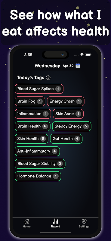 Каждый прием пищи рассказывает историю, и мы здесь, чтобы ее перевести. После анализа ваших фотографий еды приложение ежедневно предоставляет вам метки, которые показывают, как ваши привычки в еде влияют на ваше здоровье. Вы можете увидеть такие вещи, как «Скачки уровня сахара в крови», «Мозговой туман» или «Старение кожи». Эти теги помогут вам связать то, что вы едите, и то, что вы чувствуете.