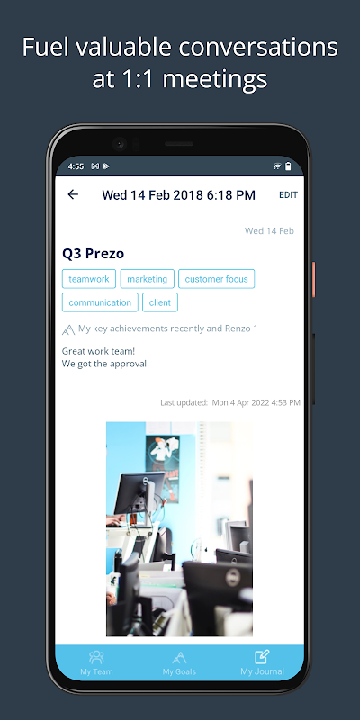 Менеджеры могут быстро оценить работу членов своей команды. Превратите ваши встречи один на один в непрерывный разговор с целями вашей команды и отзывами прямо у вас под рукой.