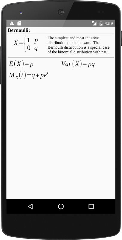 Compiled here is the most vital information on each of those distributions, Keep this app on your telephone screen while working practice problems to simplify the process of finding the formulas for the expected value, variance, and where applicable pdf, pmf, cdf and moment generating function. Each distribution has a short description of it's use.