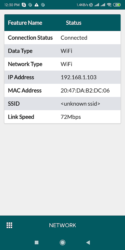 - Network Info: Data Type, Network Type, IP Address,MAC Address, IP Address, SSID, Link Speed, WiFi, Unavailable, Connected etc