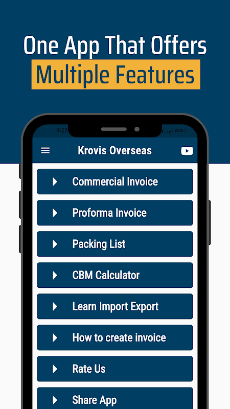 Это приложение разработано, чтобы сделать ваш экспортно-импортный бизнес более продуктивным. Вы можете делать неограниченные бесплатные экспортные счета и упаковочный лист. Создавайте неограниченное количество экспортных счетов без абонентской платы. Это приложение предоставляет комплексные решения для импортно-экспортного бизнеса.