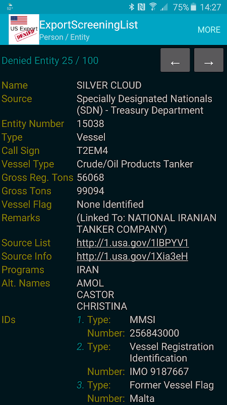 This app may be used as an aid to industry in conducting electronic screens of potential parties to regulated transactions. In the event that a company, entity or person on the list appears to match a party potentially involved in your export transaction, additional due diligence should be conducted before proceeding. There may be a strict export prohibition, requirement for seeking a license application, evaluation of the end-use or user to ensure it does not result in an activity prohibited by any U.S. export regulations, or other restriction.