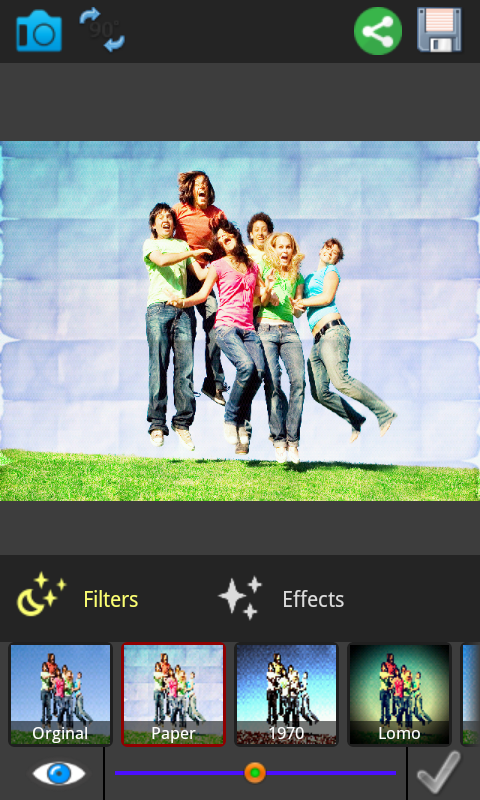 • 90+ уникальных фильтров в категориях: '' ЛОМО ',' Урожай ',' Простой тон ',' Black & White ',' Old Style ',' Холодные тона "," Теплые тона "и" Искусство ".