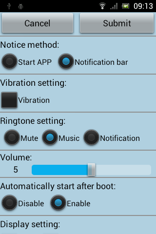 5 Нажмите кнопку "Настройки" значок, чтобы установить напоминания режиме / рингтон / вибрация / объем / цикл и настройки дисплея / виджет записи отображаются на экране.