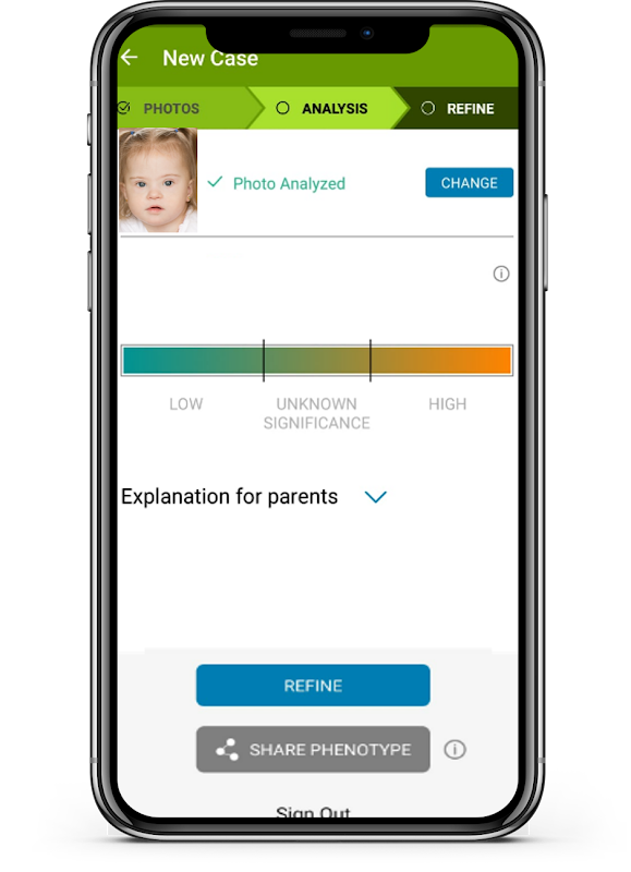 Приложение для глубокого фенотипирования, которое облегчает всестороннюю и точную генетическую оценку и оценивает вероятность того, что пациенту может быть полезно дальнейшее тестирование для выявления возможных основных генетических состояний.