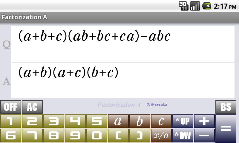 多変数多項式の因数分解<Factorization>/展開<Expansion>用の電卓アプリです。x, y, z(または a,b,c)3変数で各変数とも5乗までの数式が考慮されます。
