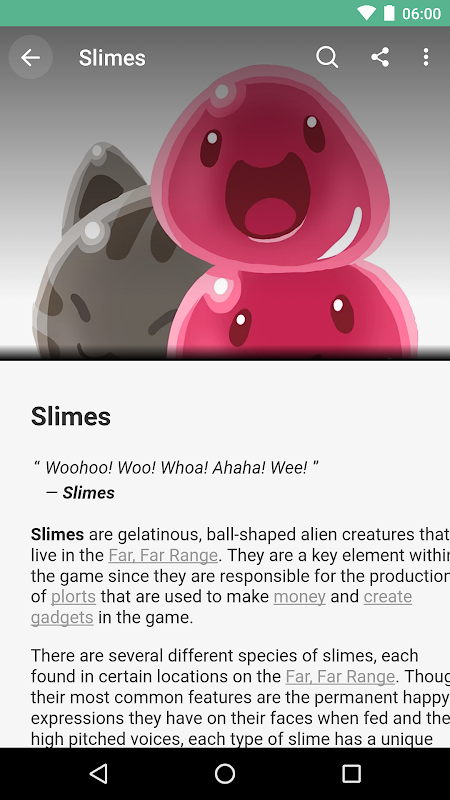 Fandom's app for Slime Rancher - created by fans, for fans. Fandom apps are always up-to-date with highly accurate, real-time information from Fandom’s vast fan community. The Slime Rancher app features hundreds of pages of content created by fans just like you. Find in-depth articles on slimes, plorts, locations, treasure pods, plots, and much more. No other app offers this amount of accurate insights, tips and information with useful companion features such as: